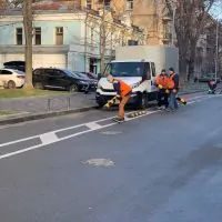 Фото. На Золотоворотской восстанавливают делиниаторы, защищавшие велополосу от парковки автомобилей