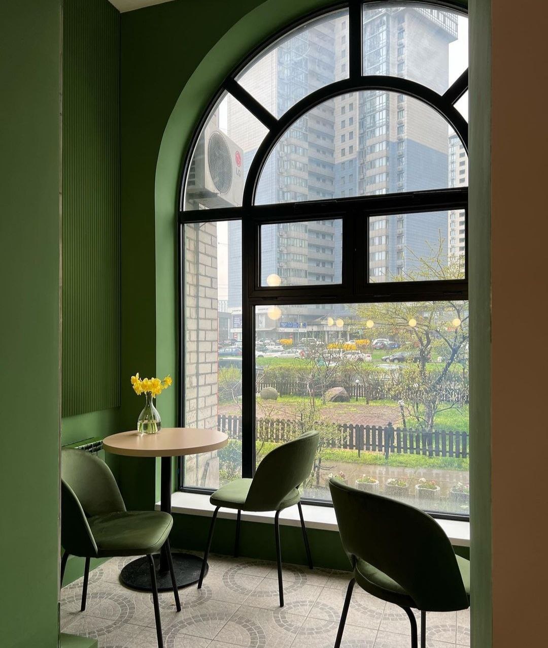 Вместо стульев в заведении поставили пуфы. Окна здесь панорамные. За ними расположены отдельные арки: их обустроили как места для рассадки.