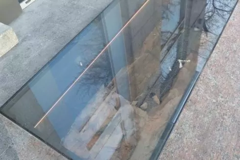 Зондаж расположен на ступеньках, ведущих в ресторан «Завертайло». Под стеклом, вероятно, расположены остатки старинного кирпичного забора усадьбы Софийского собора.
