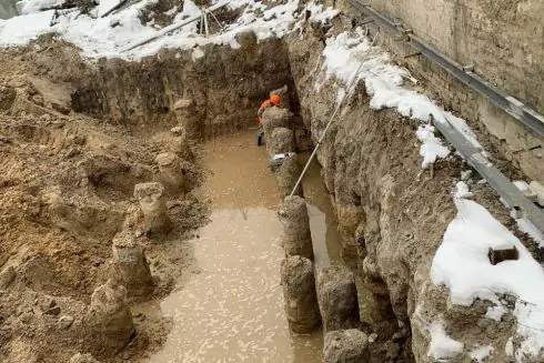 "Строительная техника роет котлован. В дальнейшем здесь планируется сооружение подземного паркинга. Буровые сваи зацепили верхний водоносный горизонт, поэтому теперь здесь образовалось небольшое "подземное" озеро", - говорится в сообщении.