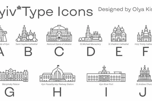 Шрифт и пиктограммы бесплатные. Их можно использовать в постерах, на картах, объявлениях, печатать на одежде, создавать принты. Это изображение главных достопримечательностей Киева: музеи, памятники, соборы и тому подобное. Художница искала иконки Киева для одного проекта еще 8 лет назад, но не нашла и решила нарисовать свои. Ольга начала создавать иконки еще в 2012, часть дорисовывала в этом году. Сейчас их 38.