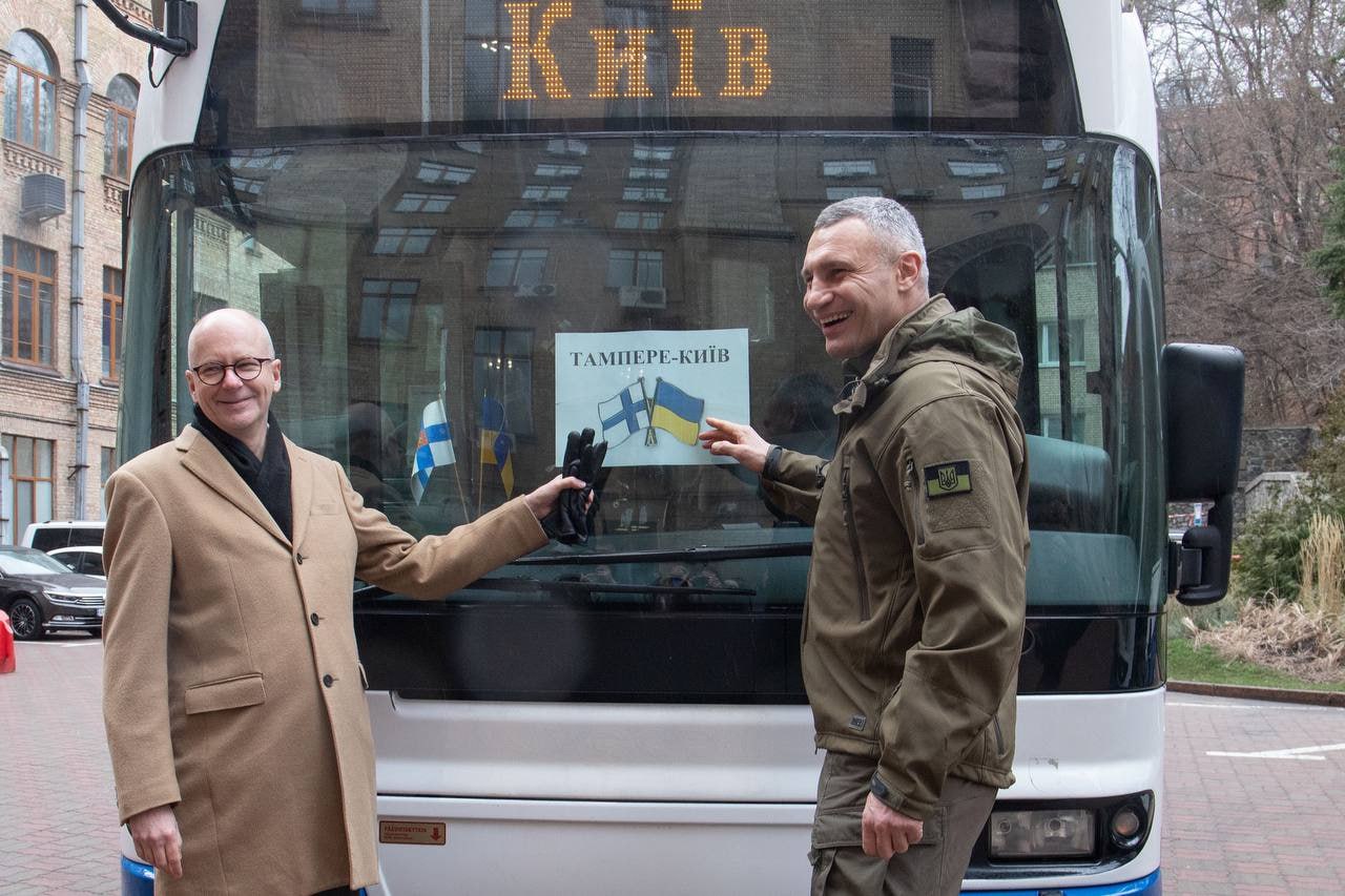 Отмечается, что в автобусах приехала гуманитарная помощь. Ее собрали для столицы городские власти Тампере с активными гражданами Финляндии.