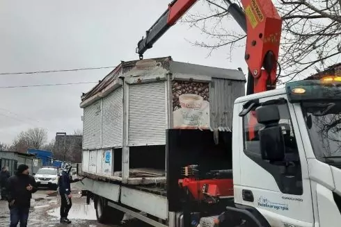 На территории возле Дарницкого вокзала в Киеве убрали 12 торговых контейнеров, МАФов и передвижных киосков.