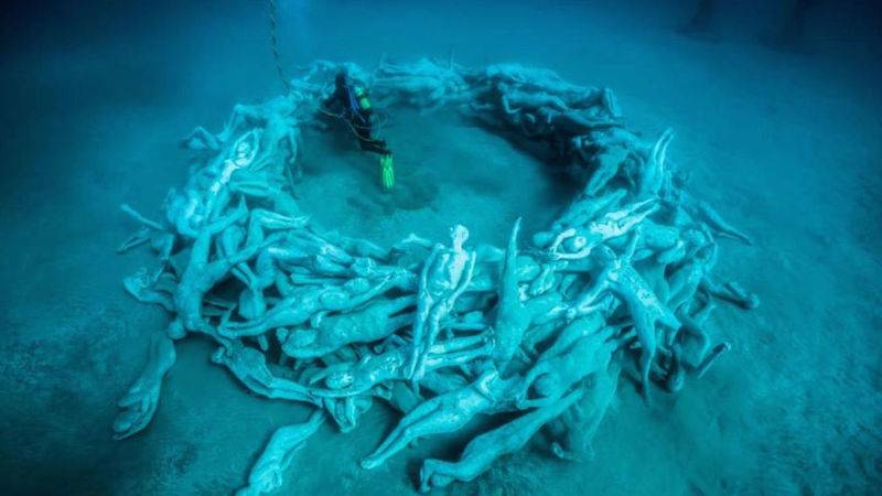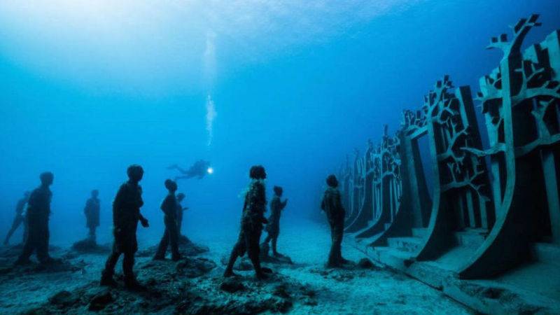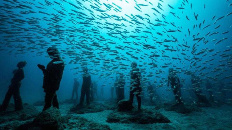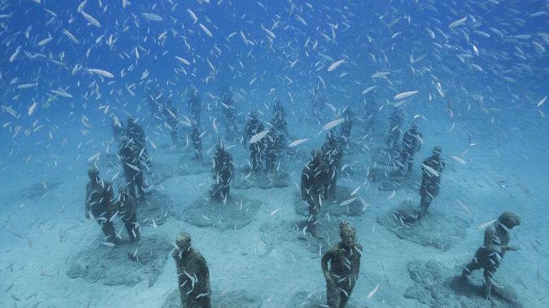 Идея: Художник Джейсон Тейлор создал парк подводных скульптур вблизи испанского острова Лансароте. Он установил на дне океана более 300 фигур людей. Они сделаны из Ph-нейтрального материала и безопасного для природы.