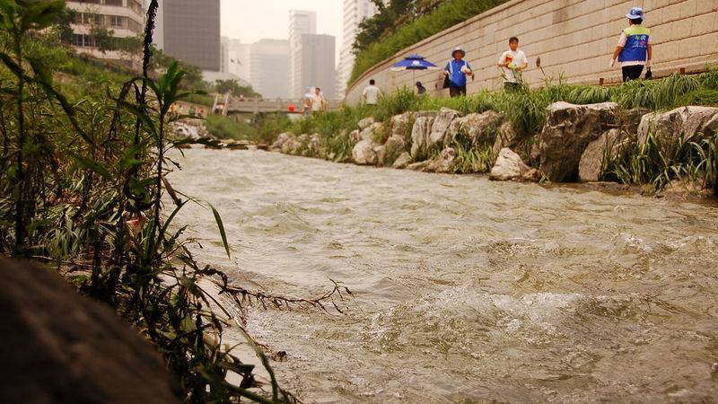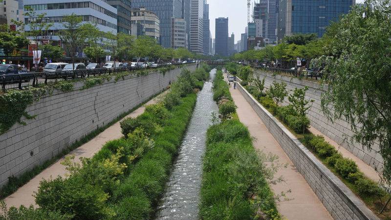 Проблема: В 50-х годах, после Корейской войны, район вокруг ручья Чхонгечхон в Сеуле был сильно разрушен. В водоем сливали нечистоты и мусор, и никто не переживал по этому поводу. В 60-х годах власти опомнились и решили бороться с создавшимися антисанитарными условиями. Снесли старые трущобы, переселили жителей, а русло реки спрятали в подземную трубу и построили скоростную двухъярусную автомагистраль над ним. Со временем сильный шум от магистрали и загазованность воздуха стали серьезной проблемой для города.