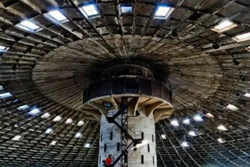 Это круглое одноэтажное здание (диаметром 160 м и общей площадью 20 тыс. кв. м) внутри похоже на огромный гриб. Оно имеет только одну опорную колонну по центру, от нее тянутся 186 тросов, которые держат и бетонные плиты потолка.