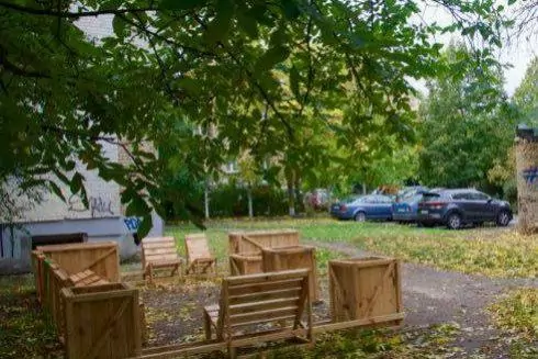 Во дворике установили уличную мебель и кадки для растений. Их на протяжении трех недель мастерили сами жители Подола под руководством архитектора Сергея Ковалева, который разработал для проекта специальную модульную мебель — ее легко собирать даже тем, кто никогда не имел дела с чем-либо подобным.