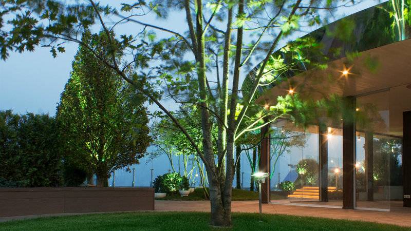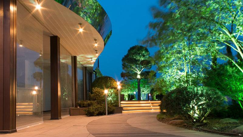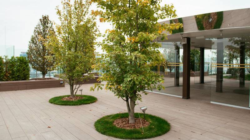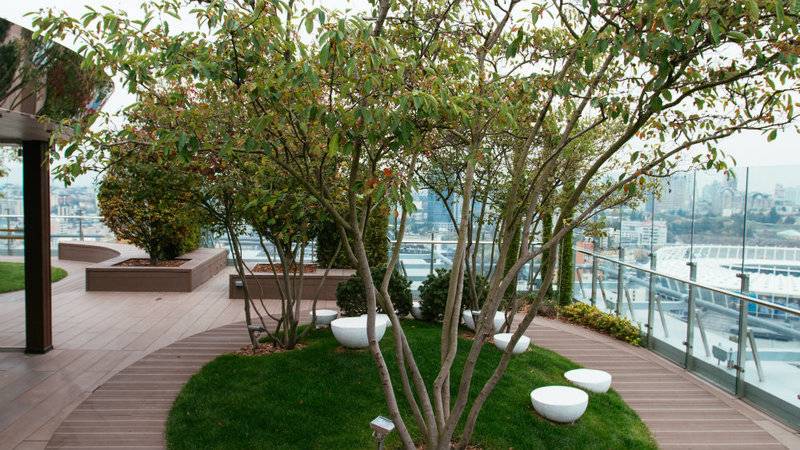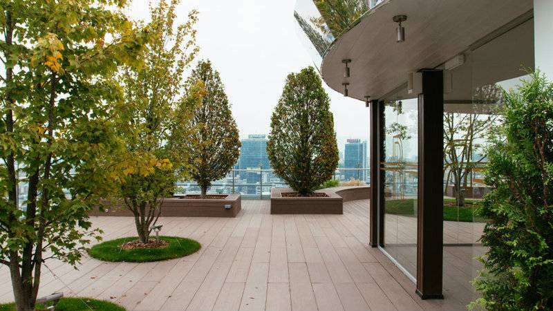 Его площадь — около 1000 квадратных метров, а разместился он на высоте 30 этажа. Все пространство крыши занимают зеленые аллеи с деревьями, кустами и газонами, лаунж-бар и панорамная площадка с видом на центр города.