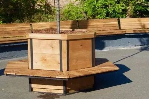 Все деревянные конструкции изготовлены из качественных дубовых досок. В новое кашпо высадили саженец декоративной сливы.