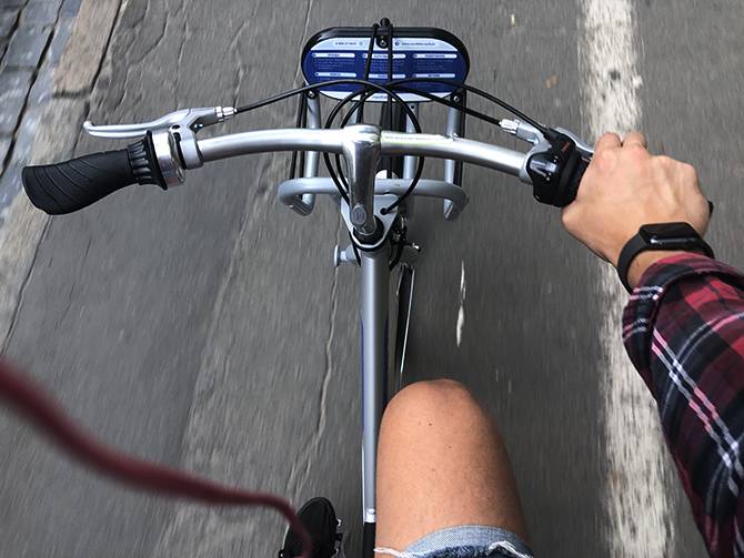 В пункте старта нам достался последний велосипед. Берем его и решаем прокатиться через Крещатик и Владимирский спуск на Контрактовую площадь — удобный маршрут для тех, кто живет в центре, а работает на Подоле.