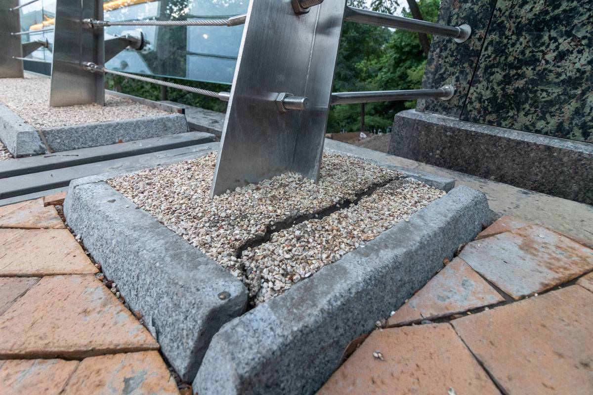 Небольшая трещина появилась на крайней опоре перила со стороны Владимирской горки. Кроме того, тросы, которые стягивают остальное ограждение, ослабли и провисли. Также видны зазоры и с другой стороны крепления, которые врезаны в парапет.