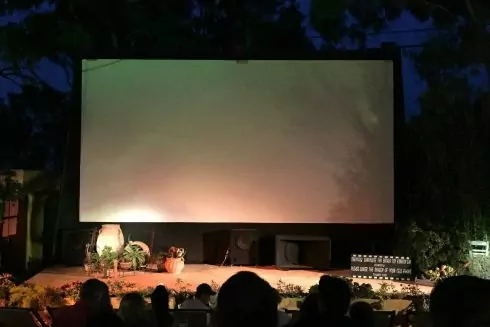 Старт первого воскресного показа в 21:00. На территории есть пуфики, но все же лучше захватить с собой пледы или еще что-то для комфортного размещения. Размеры экрана - 4 на 5 метров.