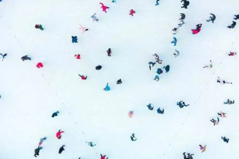 Здесь играет рождественская музыка, а ледовый стадион украшен гирляндами и лампами.