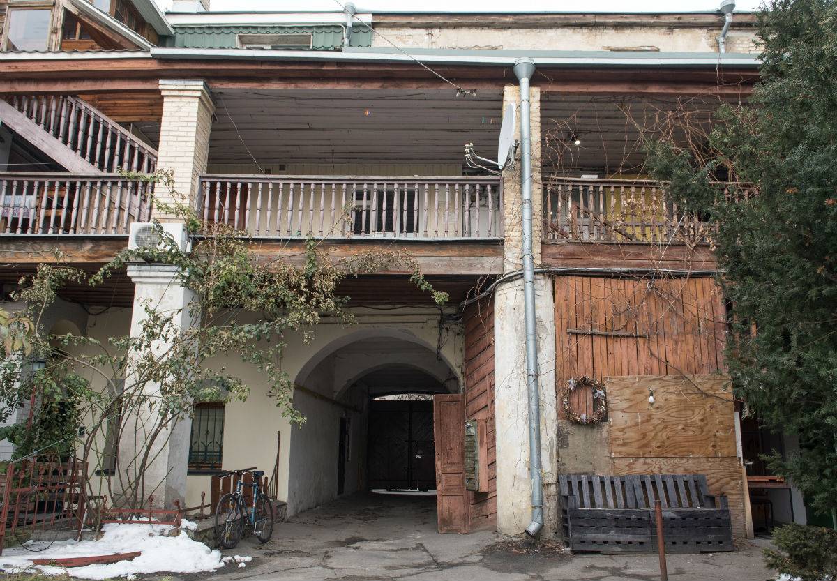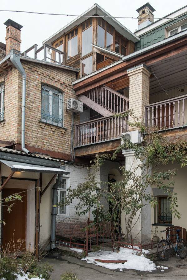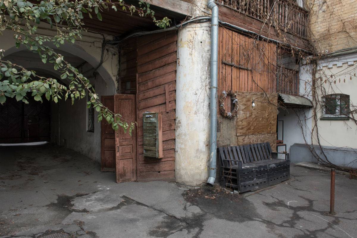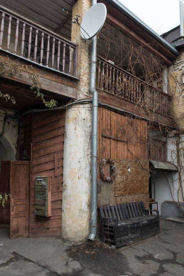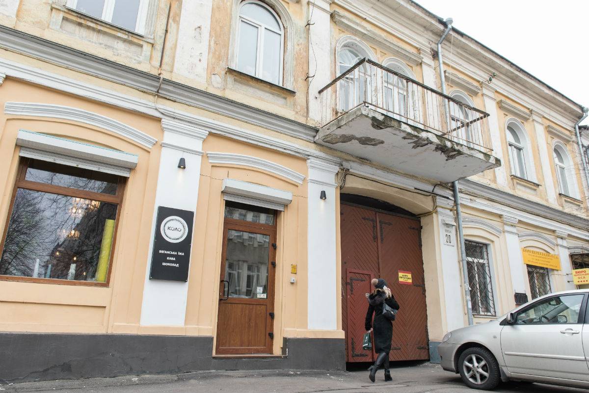 На Подоле по улице Ильинской, 20 находится старинный двухэтажный жилой дом. На его первом этаже размещаются заведения, на втором — квартиры вперемешку с мастерскими дизайнеров и швей.