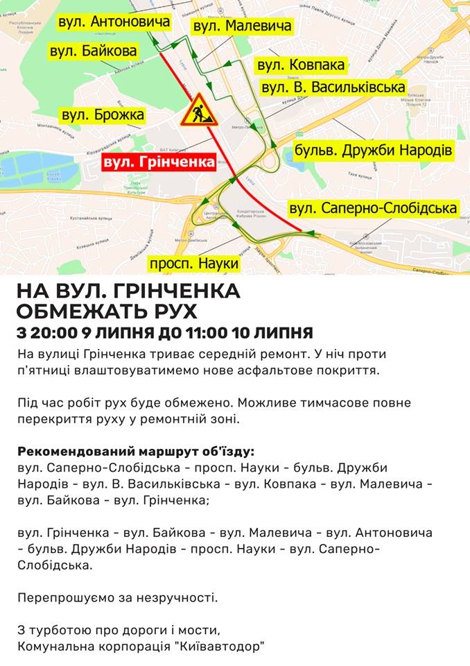 ул. Гринченко – ул. Байковая – ул. Малевича – ул. Антоновича – бульв. Дружбы Народов – ул. Науки – ул. Саперно-Слободская.В ночь с 7 на 8 июля будут проводиться работы по асфальтированию участка на Надднепрянском шоссе. Движение ограничат с 21:00 7 июля до 9:00 8 июля.