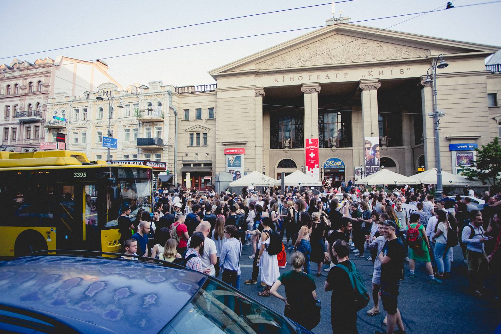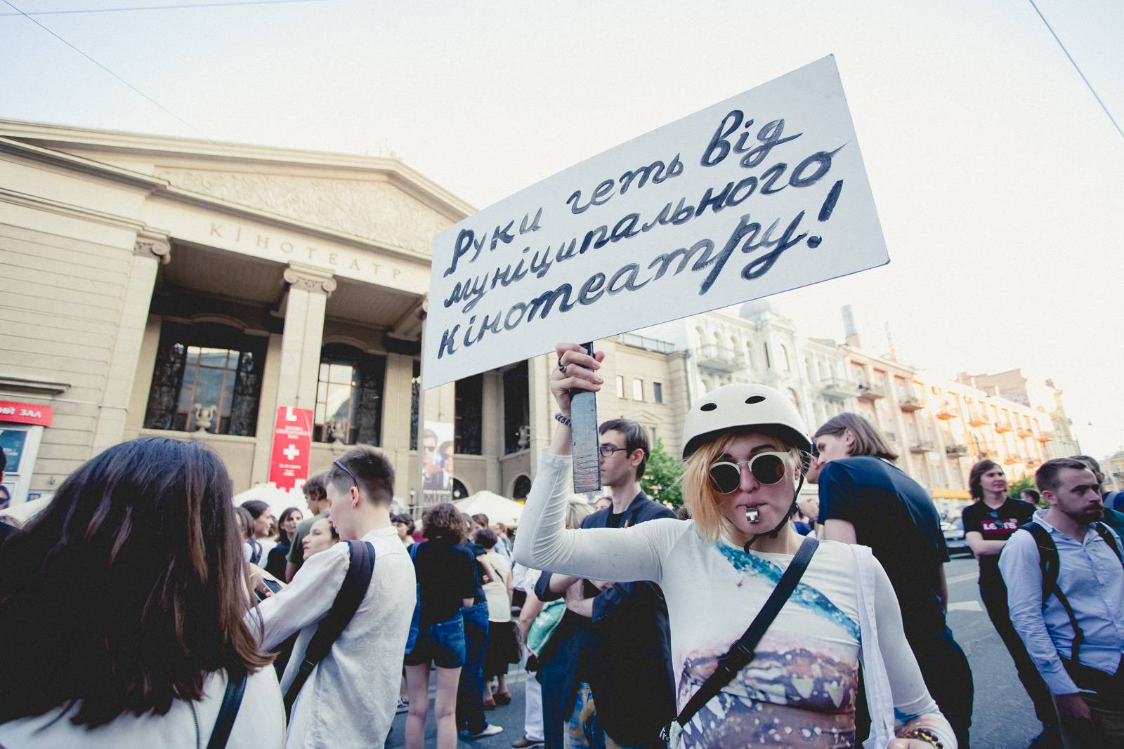 Вчера, 7 июня, под кинотеатром «Киев» устроили акцию в защиту кинотеатра: с вечера до поздней ночи более сотни протестующих перекрывали движение по ул. Большой Васильковской, не пропуская транспорт. Таким образом активисты протестовали против незаконной, по их мнению, передачи кинотеатра «Киев» другому арендодателю.