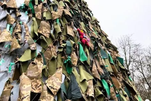 Перед праздниками ее украсят шестью маскировочными сетками, которые сделали волонтеры. Елка будет иметь 6 секций – каждая шесть метров в высоту и ширину 2,5 метра.