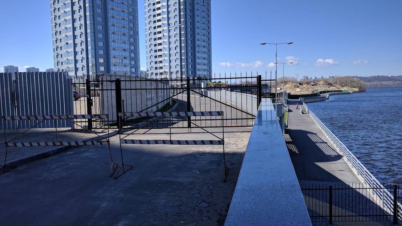 Застройщик ЖК Riverstone сделал кирпичный забор, чтобы создать частный выход жителей комплекса к Днепру. Между активистами и девелопером возник спор. Первые утверждают, что выход к воде должен быть беспрепятственным для всех граждан. Застройщик же утверждает, что территория закрытой набережной является гидротехническим сооружением, которое предупреждает размыв берега и защищает комплекс от наводнений.