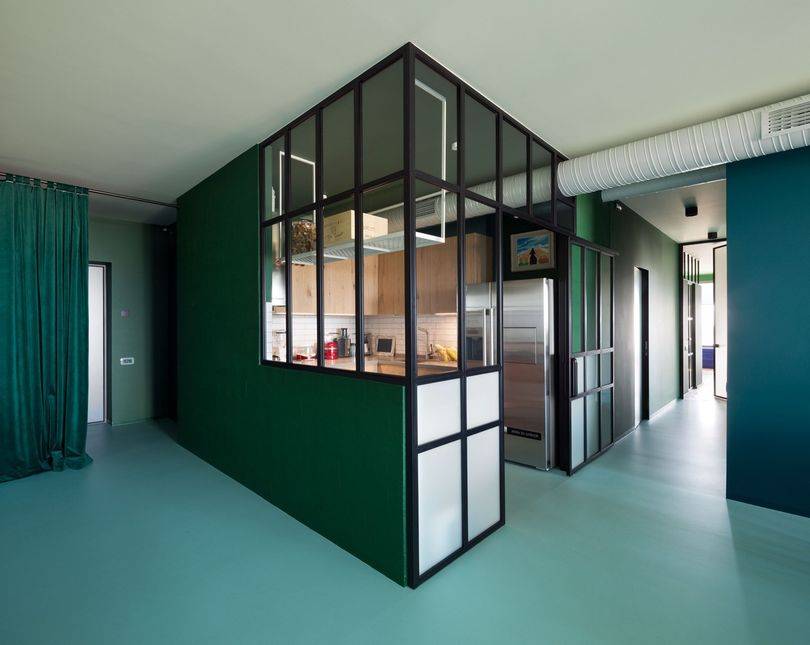 Цветные плоскости в зелено-синей гамме создают контраст с бетонными стенами, превращая помещения в калейдоскоп.