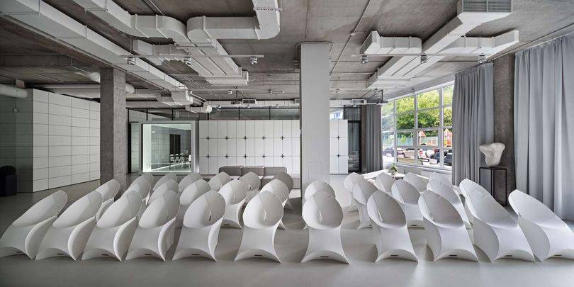 Просторный офис в Киеве выполнен в строгом минимализме, где главным является сочетание чистых белых и бетонных плоскостей. Роль ярких деталей исполнили стулья оригинальной формы в лектории.