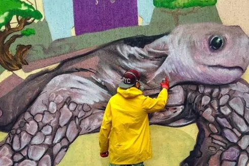 На фасаде одного из детских садов появился новый мурал с деревьями и большой черепахой, сейчас над ним работает киевский художник Виталий Гидеван.