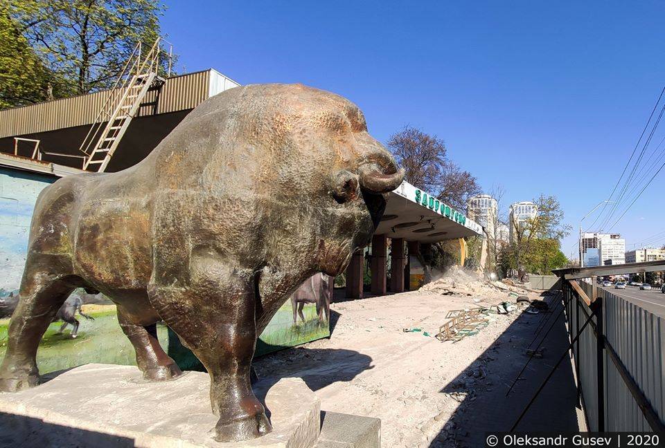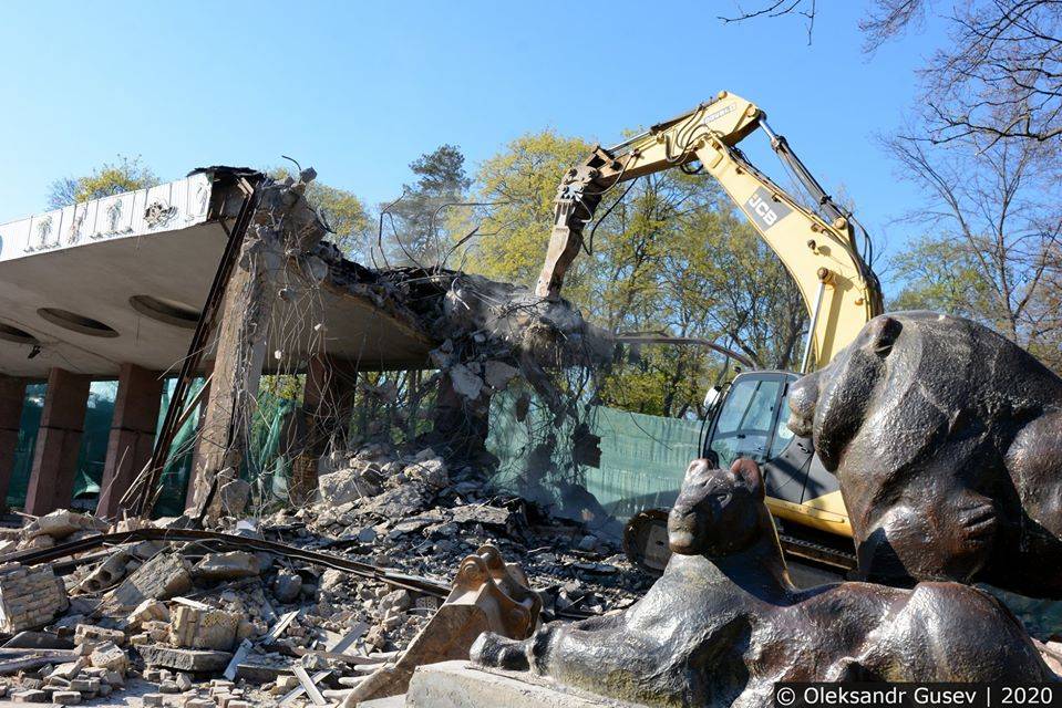 В рамках реконструкции в Киевском зоопарке снесли модернистскую входную группу. Бронзовые скульптуры львов и бизона, которые стояли у входа с 1968 года, заменят на копии.