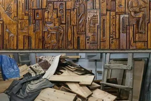 В Центре культуры и искусств НАУ в связи с ремонтом в холле, где должно появиться кафе, демонтировали резное панно из дерева. Панно украшало здание 40 лет.
