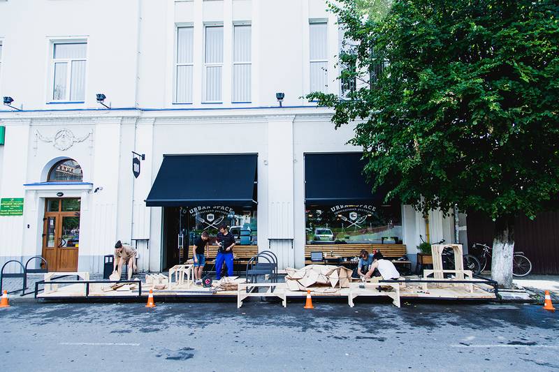 Недавно в Ивано-Франковске рядом с общественным рестораном Urban Space 100 появилось необычное сооружение. На деревянном помосте установили уличную мебель, велопарковку, пространство озеленили. Конструкцию разместили прямо на дороге, там, где раньше парковались машины.