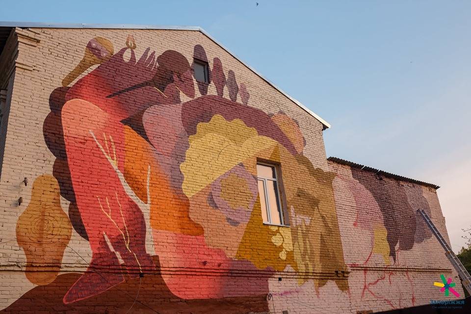 Им предложили выбрать стены среди запорожских школ искусств – и каждый художник выбрал свой формат. Автор мурала «Папа с дочкой» в Школе Искусств №2 – Саша Корбан, «Круговорот» в Школе Искусств №3 – Андрей Кальков, а Славик Шум и Настя Ку нарисовали в Музыкальной Школе №1 мурал «Муза».