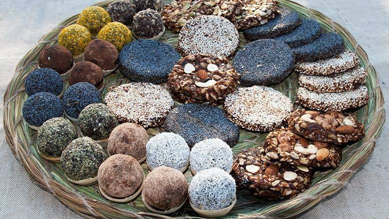 Готовят, кроме прочего, и сыроедческие сладости из сухофруктов, орехов, семян и кэроба. Есть пастила, конфеты с черносливом, козинаки, марципаны, трюфели, шоколадный чизкейк. В общем, все довольно калорийное из-за большого количества орехов и сухофруктов, но все-таки это полезная альтернатива классическим пирожным.