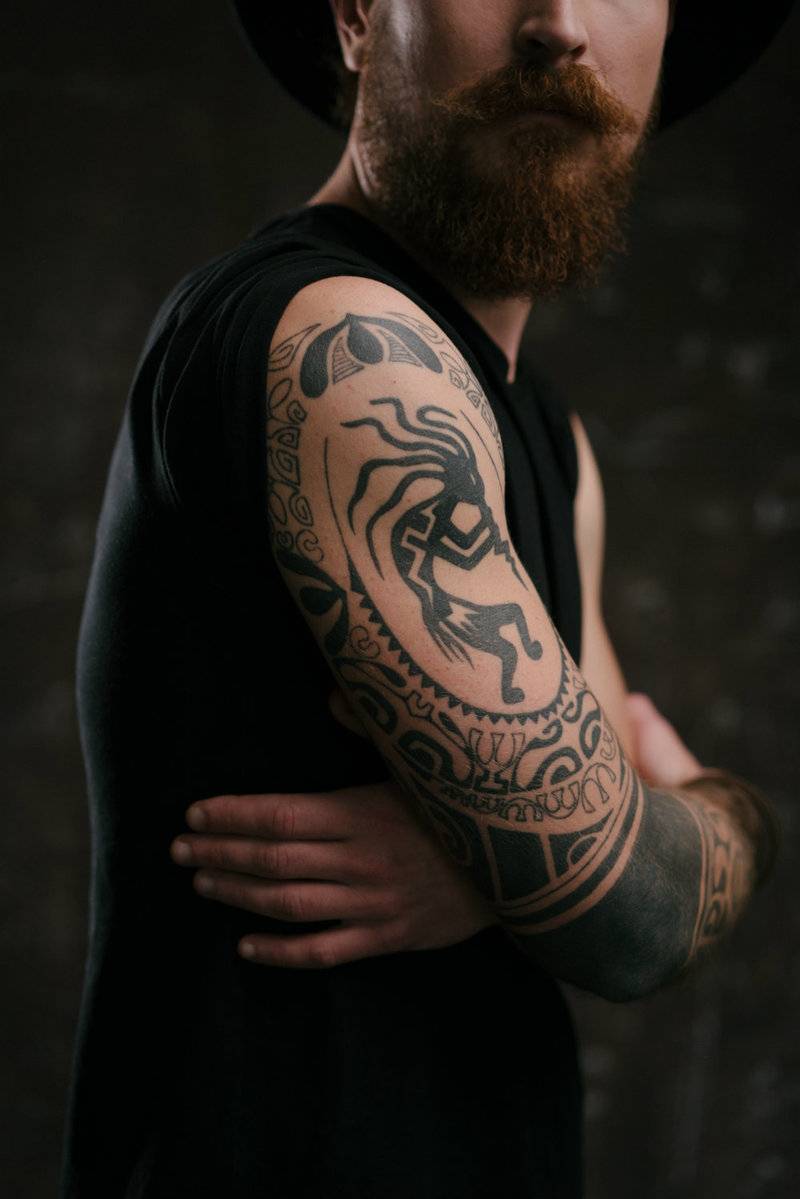 Я долго хотел татуировку, но не знал, что именно, а что-нибудь не хотел бить. Очень много классных работ откинул, просто потому что не видел их на себе. Потом однажды увидел работы в направлении Полинезии, народов Майя. Увидел бога Кокопелли и сразу понял, что это мое. У него дреды, он сутулый, в руках музыкальный инструмент — флейта. Я понял, что он - мой символ.