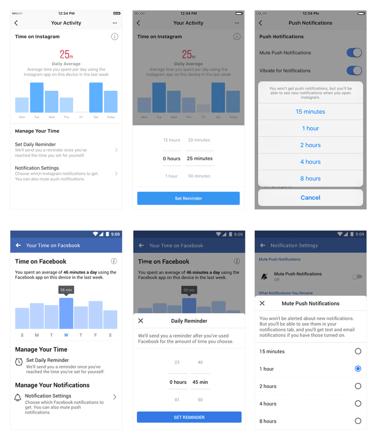 Компания Facebook также запустила инструмент для ограничения времени, проведенного в Facebook и Instagram. В настройках соцсетей можно установить лимит времени. Для этого в Instagram нужно зайти в раздел Your Activity, а в Facebook – Your Time on Facebook.