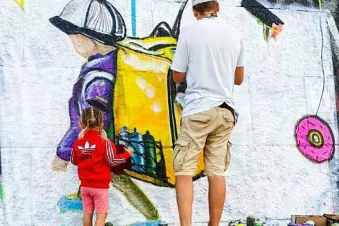 В Киеве на набережной Днепра возле Почтовой площади (Набережное шоссе) появился новый мурал от художника Виталия Гидевана. На нем изображен маленький мальчик с большим желтым рюкзаком на спине: рисунок посвящен киевским доставщикам еды, рассказал художник для «Информатора».