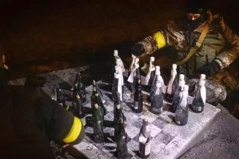 Однако шахматы необычные, ведь фигуры не из дерева, слоновой кости или пластика, а из коктейлей Молотова.
