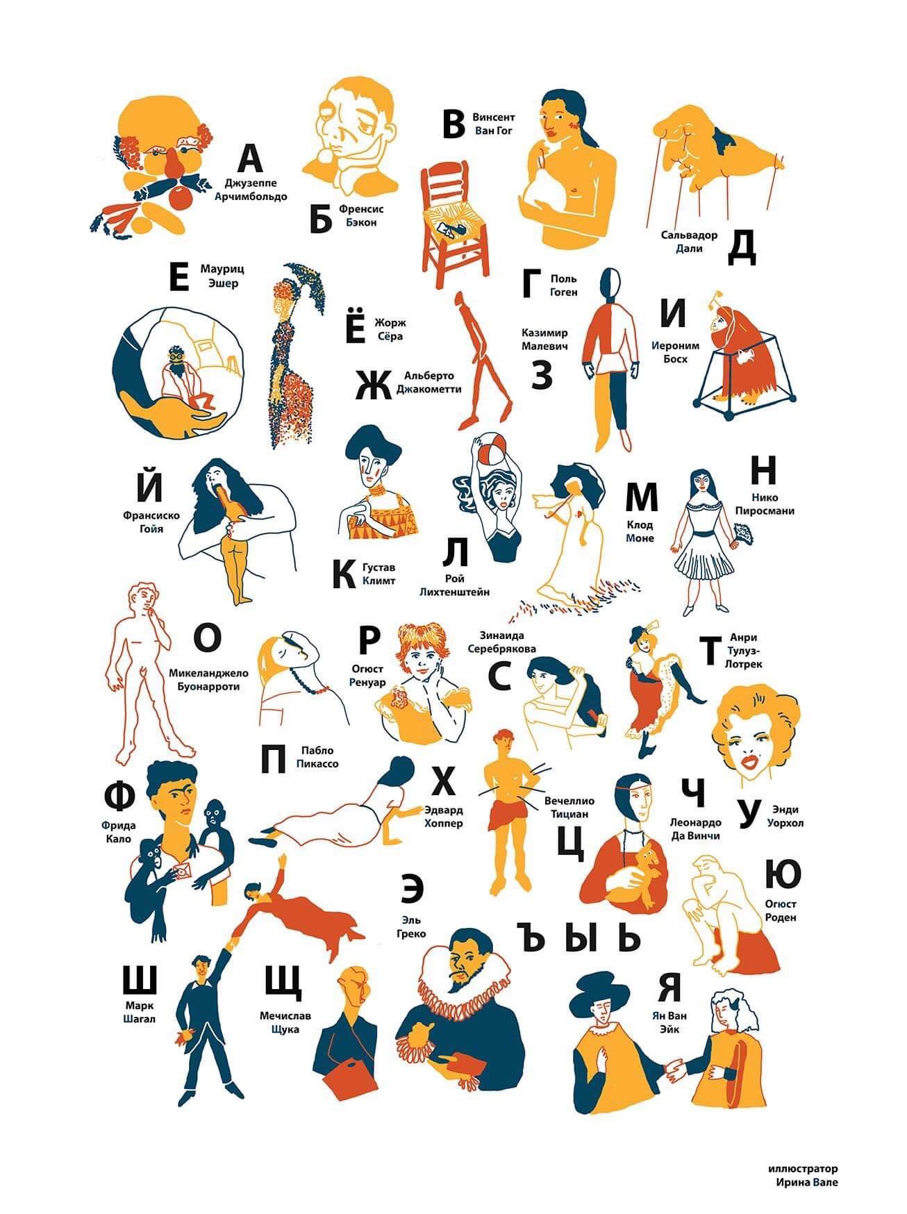 «Это определенные качества, умения или судьба? Из этих размышлений родилось два проекта. Первый это плакат-алфавит, где каждая буква это иллюстрация одной из картин мировых художников. Например, Д – Дали, В – Ван Гог», – рассказывает Ирина.