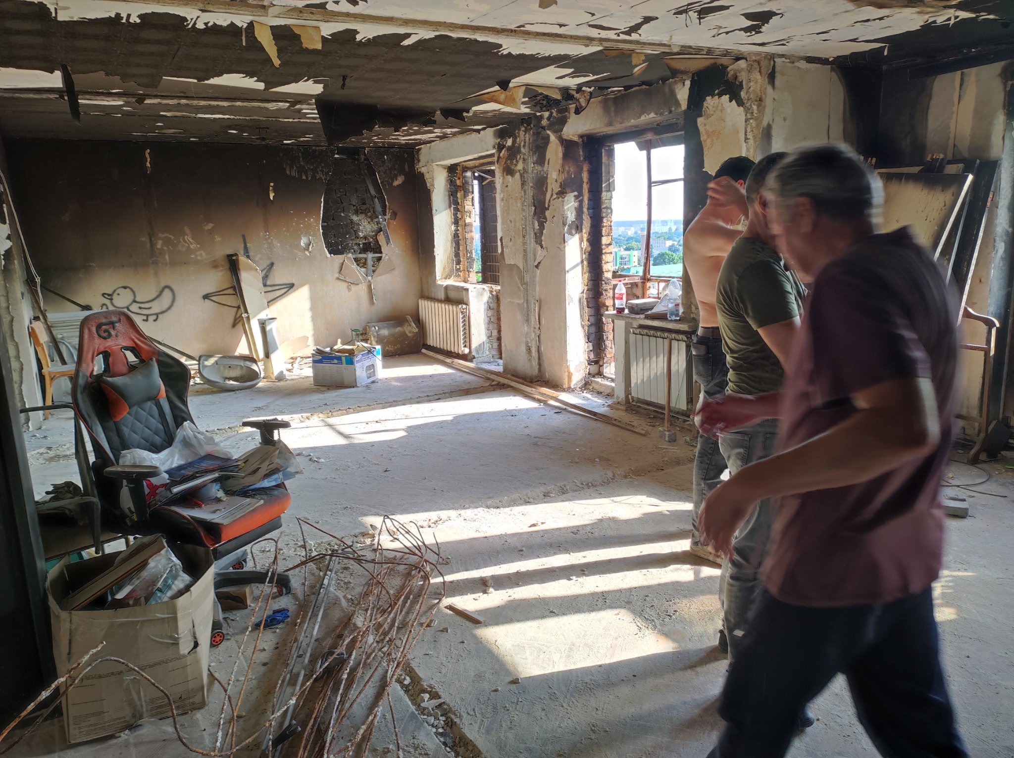 Команда помогает с ремонтом в уцелевших домах, где взрывной волной были повреждены все окна, чтобы жители могли быстрее вернуться домой и комфортнее пережить зиму.
