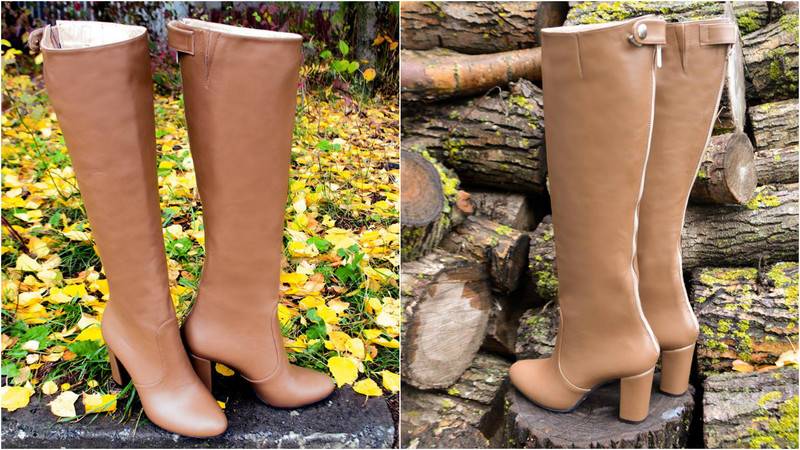 На зиму предлагают бежевые сапоги высотой до колена на каблуке. Модель “европейская зима” - мех только до щиколотки. Сапоги могут быть сделаны в любом материале и цвете (лак, замш, велюр, кожа).