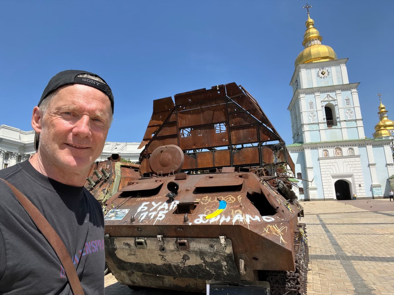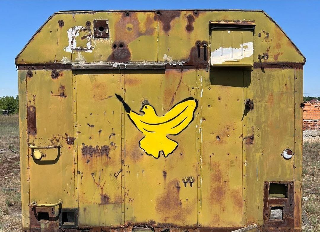 Еще один его стрит-арт можно увидеть на сожженной российской технике на Михайловской площади.