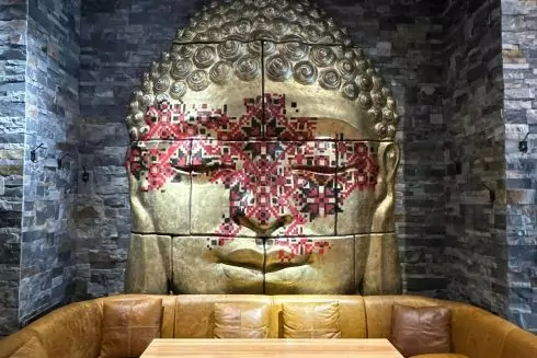 И в интерьере, и в меню азиатские детали сочетаются с украинскими: на лице Будды можно заметить украинский орнамент, а в меню найти украинский рамен с куриными кнелями. Вареники подают вареные и жареные с четырьмя вариантами начинок в стиле фьюжн. Есть отдельный "котлетка-бар" с разными видами котлет, котлету по-киевски готовят с водорослями вакаме.