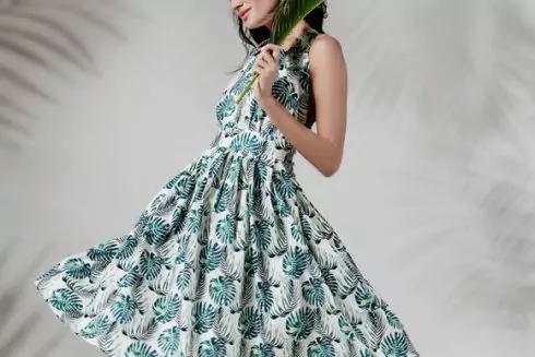 В коллекции бренда есть несколько сарафанов: короткий хлопковый с присборенной юбкой сзади и широкими бретелями на спине; мятный сарафан с цветочным принтом, рюшей по низу и планкой на пуговицах; красное и голубое приталенные платья без рукавов с пуговицами по планке и пышной юбкой.