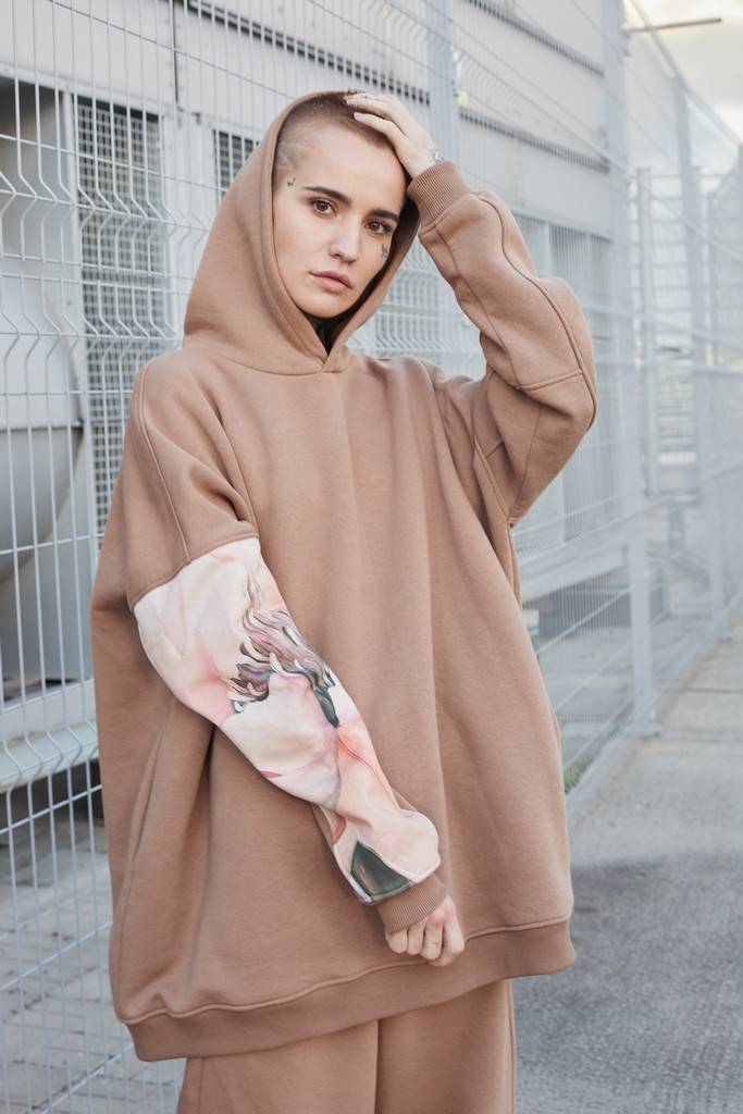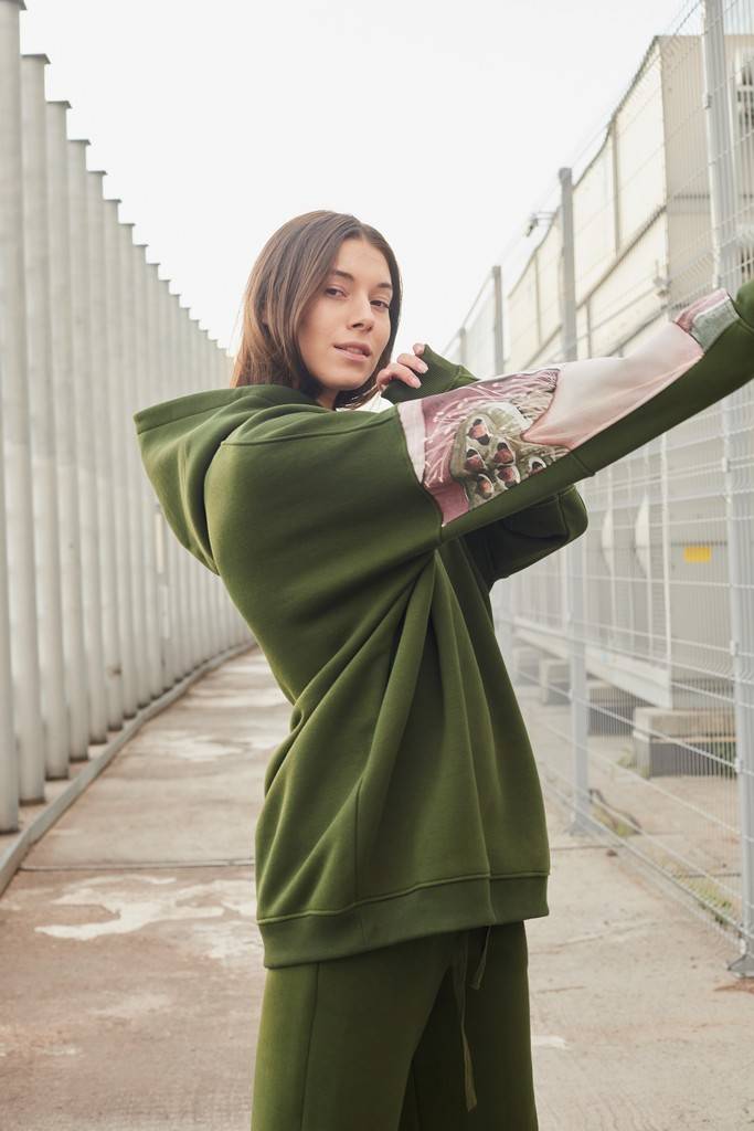 Бренд с принтами художницы Лилит Саркисян. В новой осенней коллекции — костюмы, утепленные худи оверсайз с широкими брюками прямого кроя трех цветов (зеленый, коралловый и капучино). Худи также можно купить отдельно.
