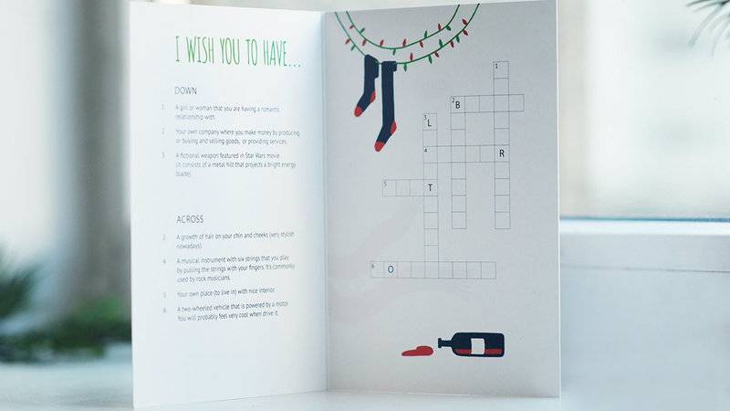 Открытки-кроссворды – это такая приятная мелочь, поэтому хочется закупить сразу пачку и всем дарить. Пожелание получателю придется составить самостоятельно, разгадав кроссворд и заодно потренировав свой английский. Есть два варианта – с Дедом Морозом и Снегурочкой. Цена – 20 гривен.
