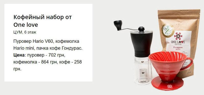 Мы выбрали подарочный набор, в который входит пачка кофе «Гондурас», пуровер и мини-кофемолка.