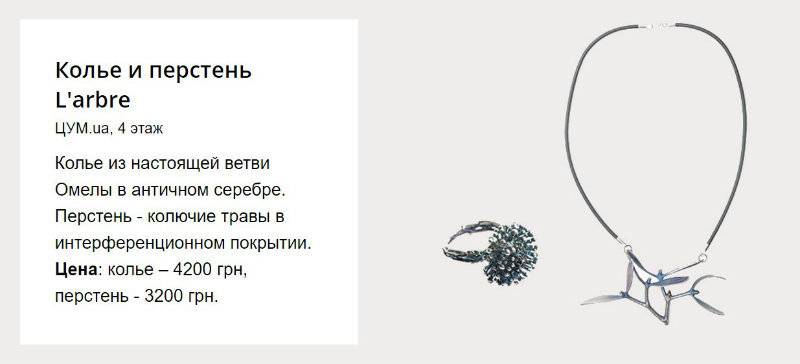В качестве подарка мы выбрали колье из настоящей омелы в античном серебре и перстень из колючих трав в интерференционном покрытии.