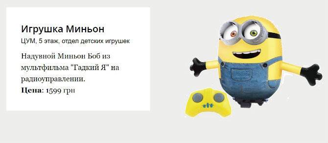 Миньон из мультфильма «Гадкий Я» – в виде большой надувной радиоуправляемой игрушки. В качестве подарка мы выбрали миньона по кличке Боб. Он издает оригинальные звуки из мультфильма. А при помощи пульта дистанционного управления его можно перемещать на расстояние до 30 метров.