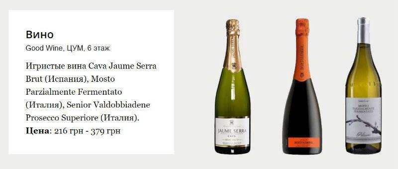 Нам понравились игристые Cava Jaume Serra Вrut (Испания), Mosto Parzialmente Fermentato (Италия) и Senior Valdobbiadene Prosecco Superiore (Италия).