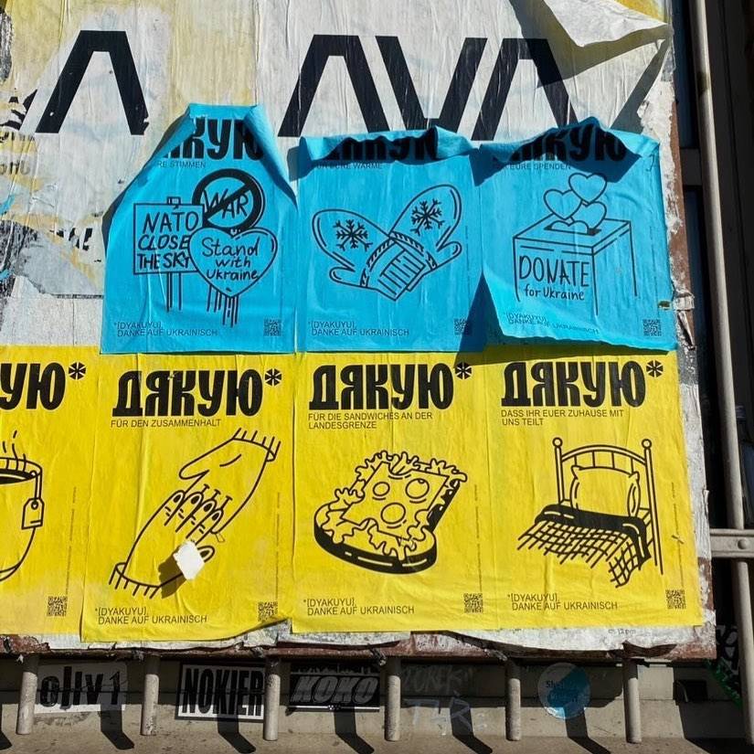 Дизайнеры Оля Кузовкина и Сергей Сербин – авторы серии постеров ukrainianssay.thankyou, которые призваны поблагодарить людей со всего мира за поддержку. Каждый может скачать постеры на сайте проекта и разместить в городе, где нашел убежище.