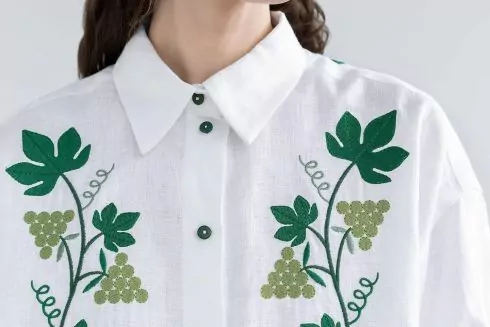 Орнамент для вышиванки разработала дизайнерка Анна Фесенко. На рубашке она изобразила цветущий виноград, которым была покрыта большая часть здания и который застройщик уничтожил прошлым летом. А на задней части вышит узнаваемый цветок с фасада здания.