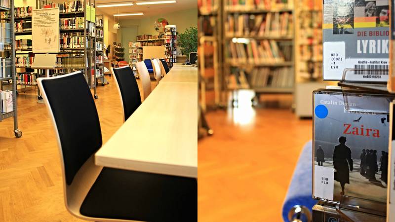 Библиотека Гете-института – это место, которое вдохновляет учиться. Если у вас застой в саморазвитии, то стоит посетить эту современную библиотеку. От изобилия новых книг, а также большего количества медиа-материалов (фильмов, аудиокниг и музыки на немецком) возникает желание остаться тут навсегда. Практически вся литература на немецком языке, но есть также немецкая литература на украинском, русском (меньше 10% всего фонда).