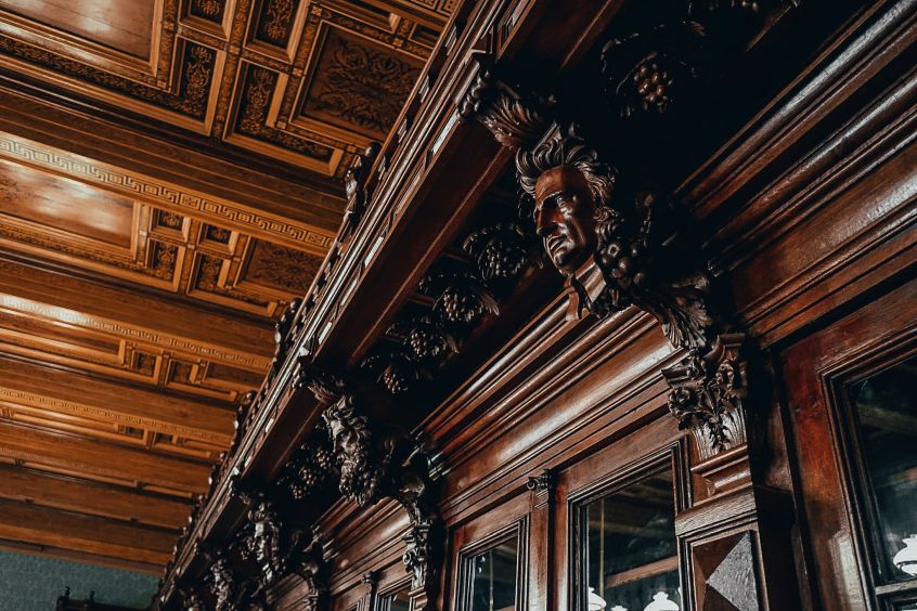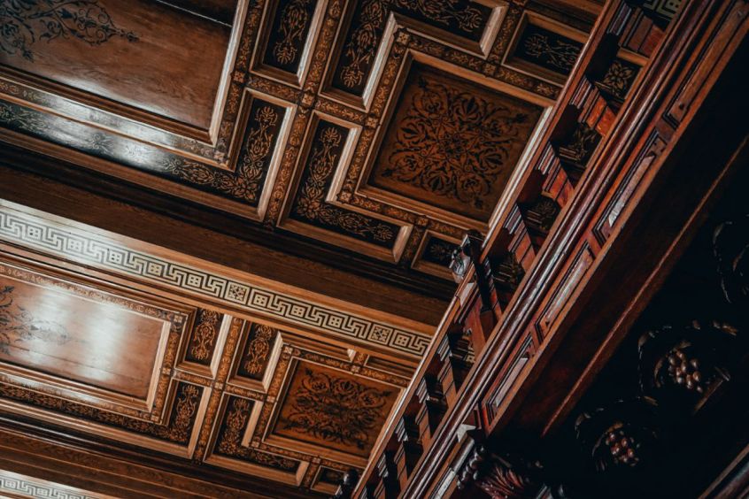 В библиотеке мастера воспроизвели подлинные росписи, которые удалось обнаружить под многими слоями краски, отреставрировали двухъярусный старинный книжный шкаф из массива дуба.